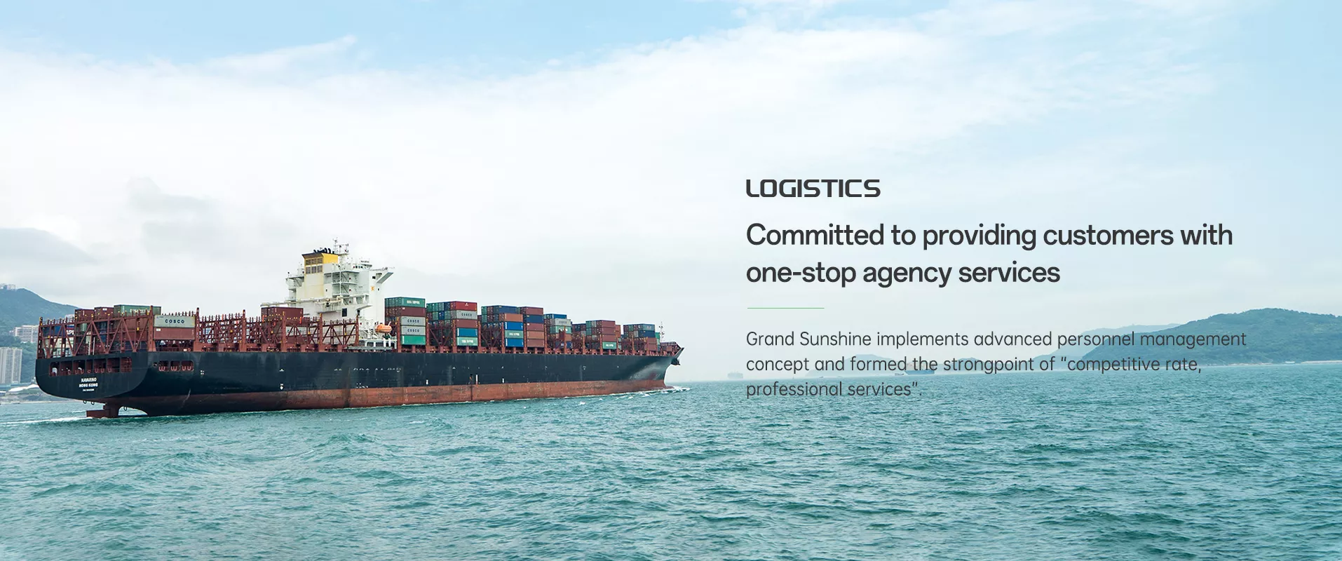 Grand Sunshine Marine Service Co.,Limited (Hereafter referred to as Grand Sunshine), is a group company physical registered in both Hong Kong and Shanghai from year of 2015. The operating office is located in Shanghai China working in the field of full Ship Agency, Marine Services and Logistics Services.